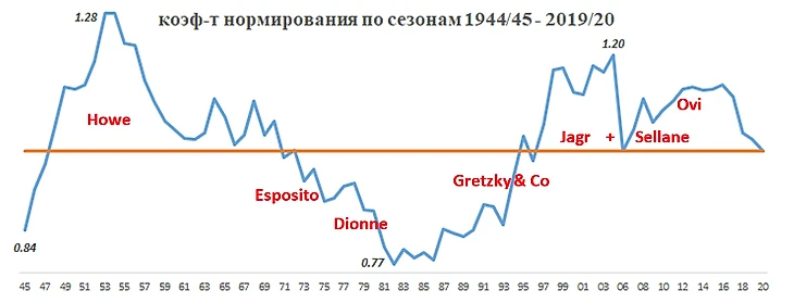 Многие говорят, что с поправкой на среднюю результативность своего времени результат Овечкина куда более выдающийся, чем у Гретцки. Вот я и сделал эту поправку.