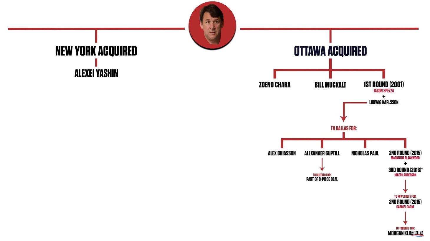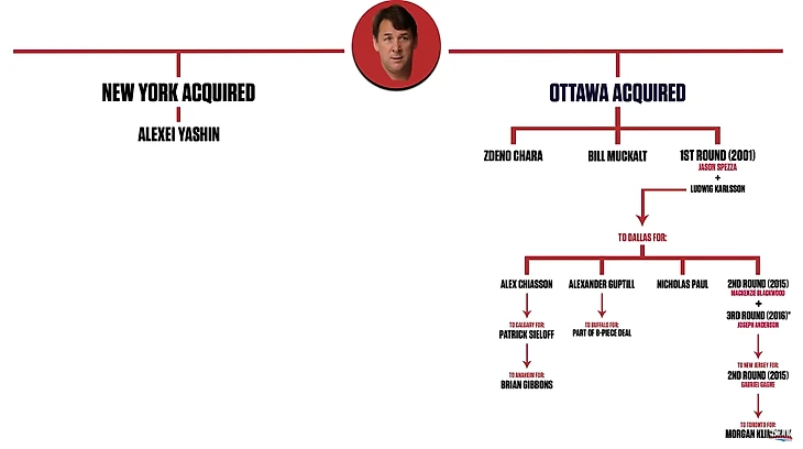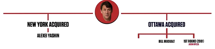 Летом 2011 года на арене появляется "Нью-Йорк Айлендерс", который говорит, что готов платить Яшину больше - 10-летнее соглашение на 64 миллиона долларов. "Оттава" не задумываясь соглашается. Взамен Яшина "сенаторы" получают форварда Билла Макалта, пик в первом раунде драфта 2001 года и одного защитника из 3 раунда драфта 1996 года, имя которого мы пока называть не будем. Билл Макалт за 70 матчей в "Оттаве" набрал лишь 8 очков, да и изначально было понятно, что это скорее довесок к обмену. Всё куда интереснее с пиком драфта: "Айлендерс" на драфтах 1999 и 2000 годов забрали 6(!) игроков из первого раунда, из которых 5(!) были в ТОП-10! Круто? На словах да, но вот на деле... К "островитянам" в руки попали Рик Дипьетро, Тим Конноли, Тэйлор Пятт, Бранислав Мезей и Раффи Торрес. Очевидно, уже тогда в клубе поняли, что с драфтами им не везёт, потому отдали свой второй пик. В 2001 году этим вторым пиком оказался Джейсон Спецца.