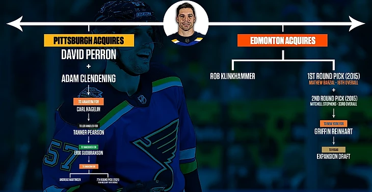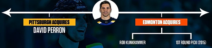 В «Эдмонтоне» подумали и решили: «у нас есть Давид Перрон, одно из немногих светлых пятен в команде, а давайте-ка его обменяем!» После классного старта своей карьеры в «Сент-Луисе» Давид Перрон плавно приходил в негодность в «Эдмонтоне». При том, что первый сезон в Альберте ему удался здорово: 28+29 и общие 57 очков – лучшие цифры в его карьере на тот момент. Однако в сезоне следующем всё пошло из рук вон плохо: лишь 5 голов и 14 передач за половину сезоне из 38 матчей. В защиту Перрона можно сказать о травмах в «Эдмонтоне» и о том, что вся команда в тот год была ужасна – более, чем на 40 очков сподобились лишь Джордан Эберле и Райан Нюджент-Хопкинс (на тот момент в составе ещё был Тэйлор Холл). И за Перрона клуб получил настоящий выкуп от «Питтсбурга» – они отдали взамен хорошего известного болельщикам КХЛ Роба Клинкхамера и пик в 1 раунде драфта 2015 года.
