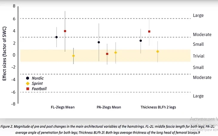 Стоит отметить, что у футболистов с более короткими головками двуглавой мышцы бедра (в среднем <10,56 см) риск травмы подколенного сухожилия в четыре раза выше, чем у спортсменов с более длинными пучками. Таким образом, с увеличением длины на 0,5 см риск травмы снижается приблизительно на ~ 74%. И, как видно из исследования, «скандинавская» группа в среднем увеличила свой показатель на 0,7 см, а группа спринта - на 1,6 см.