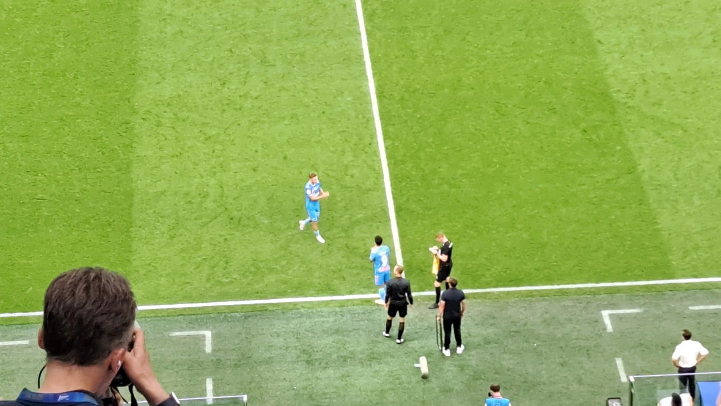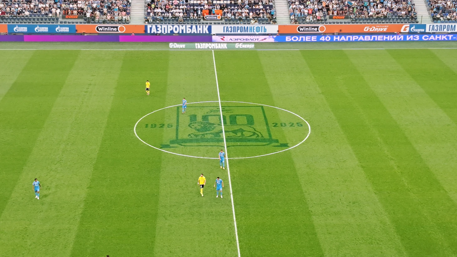В центральном круге появилось изображение праздничного логотипа, посвященного 100-лкетию клуба. Это еще, конечно, не уровень ФК «Лестер», но уже шаг в правильном направлении. Газон на «Газпром Арене» был оформлен… никак. (Впрочем, кто-то скажет, что главное – качество).