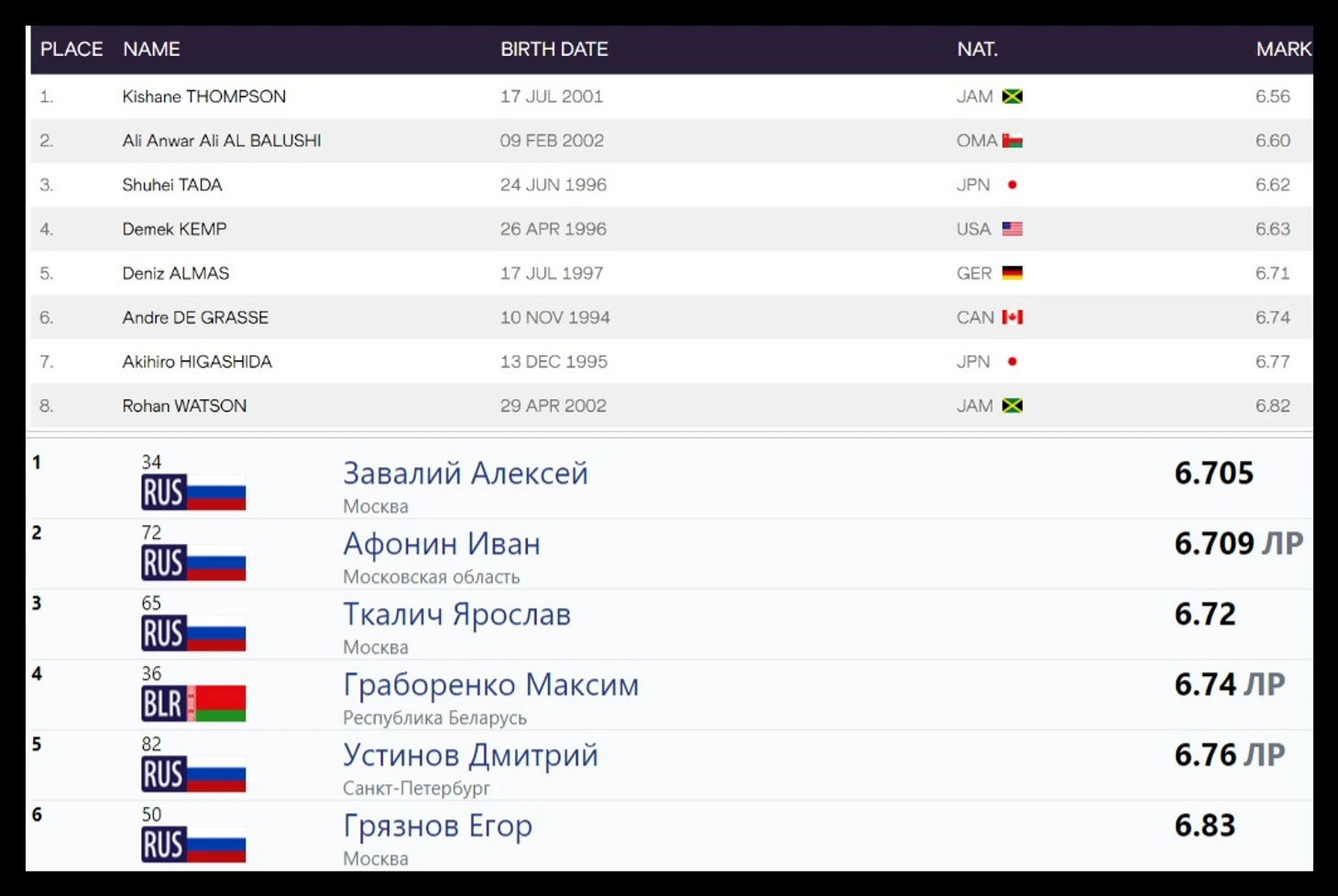 Олимпийский чемпион Токио на 200 метров и Парижа в эстафете 4 по 100 — Андре де Грасс в Казахстане оказался лишь 6, а если бы оказался в России то боролся бы за 4 место с белорусом Граборенко.