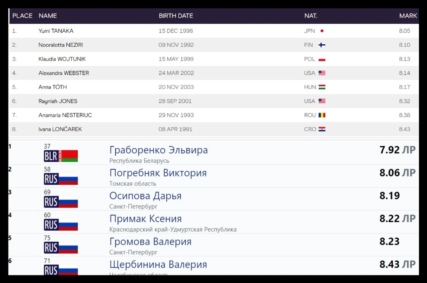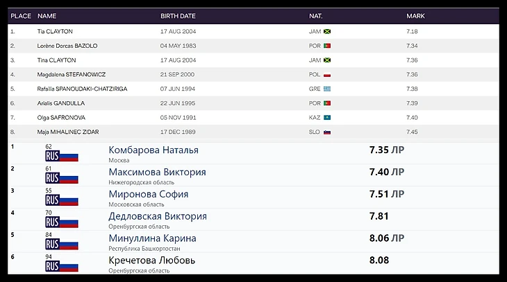 У девушек в Астане тоже не обошлось без звёзд, выиграла финалистка ОИ — Тиа Клейтон, не оставив ни малейшего шанса соперницам, а вот топ-3 замкнула её сестра-близнец Тина, и тут уже есть что сказать новому лидеру российского сезона — Наталье Комбаровой. Наташа с результатом 7,35 не только выиграла соревнования, но и попадала бы в тройку на старте мирового тура.
