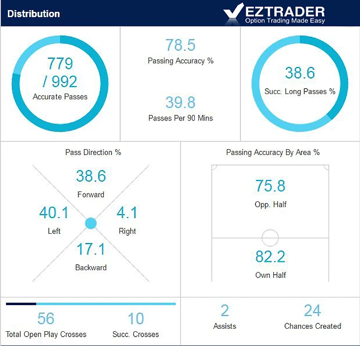 Три удара, два в створ, один созданный момент, семьдесят девять касаний, сорок пять пасов, тридцать три из которых оказались точными, четыре отбора и два фола на сопернике.