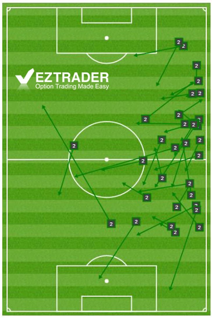 779 из 992 пасов дошли до адресата. В среднем за матч Уокер отдаёт почти сорок передач, 38,6% дальних пасов оказались удачными. Слева можно увидеть, куда Кайл чаще всего отдаёт мяч, справа - на какой половине у него лучше получается пасовать.