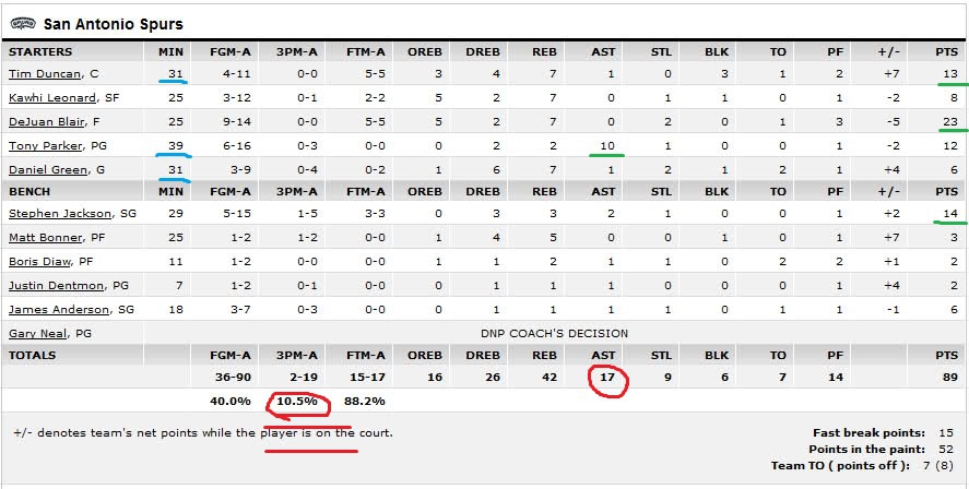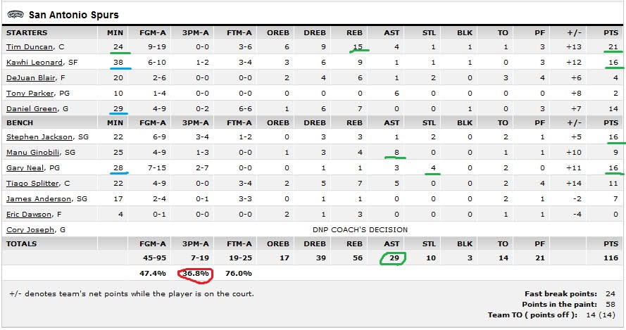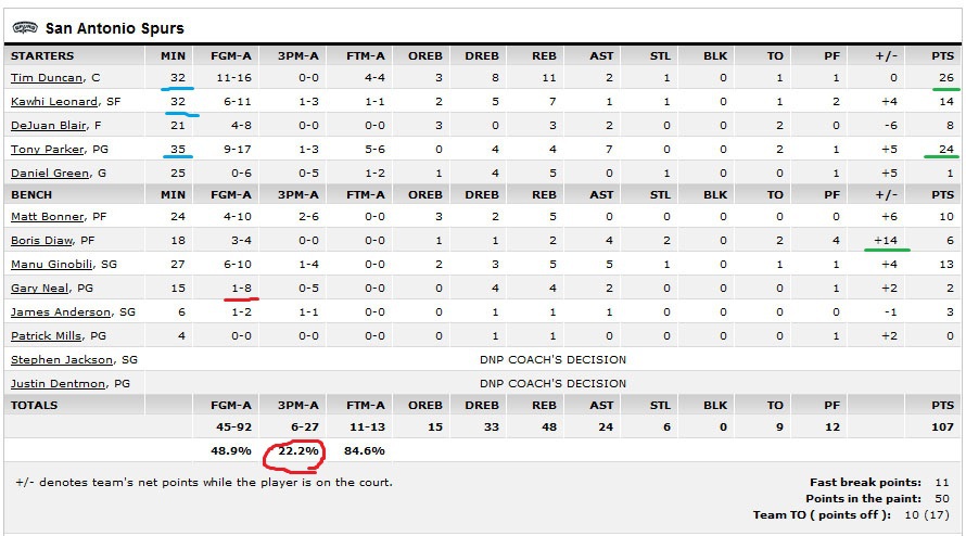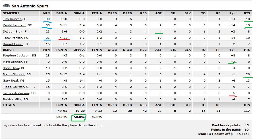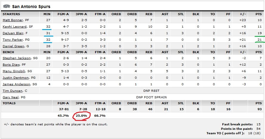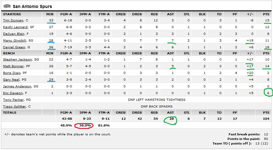 Вторую хорошую игру подряд выдает Блейр. Его взаимодействие с Ману очень эффективно. Немного передохнувший в последних матчах Леонард вновь играет больше всех (32 минуты), за это время собирает 10 подборов и 11 очков. Паркер играет своe обычное время (32), Блейр играет 31 минуту. С трешками опять засада - всего 25%. Матч по причине старости (помните в прошлом сезоне Поп уже шутил таким же образом) пропускал Тим Данкан.
