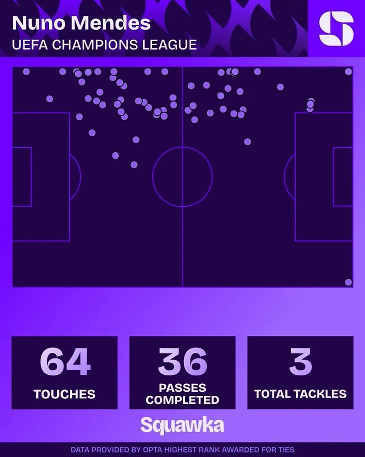 Нуну Мендеш начал в стартовом составе 16 из 17 матчей «ПСЖ» в Лиге чемпионов 2024/25, проведя на поле 1449 минут, забив 4 гола и отдав 2 голевые передачи.