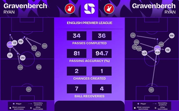 Это объясняется новой ролью Гравенберха, который взял на себя больше функций по продвижению мяча из глубины, что позволило Макаллистеру чаще оставаться выше и получать мяч между линиями.