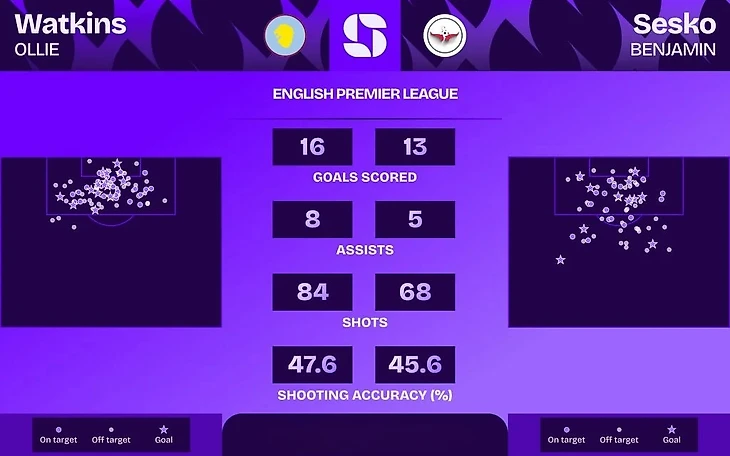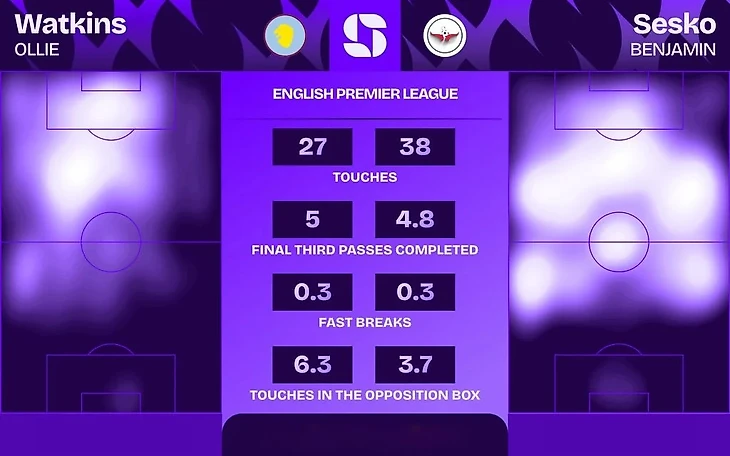 Уоткинс — классический нападающий, демонстрирующий потрясающую эффективность вблизи ворот. С показателями 6,3 касаний в чужой штрафной и 0,6 гола за матч (причем исключительно из пределов вратарской площадки), он воплощает идеал «чистого форварда».