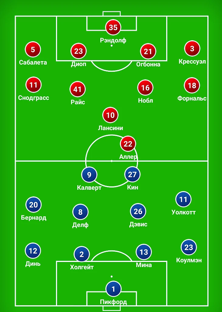 В стартовом составе гостей обращало на себя внимание отсутствие Ришарлисона, пропускавшего встречу из-за травмы, бразильца заменил пока не прижившийся в новом чемпионате Мойзе Кин. Пару итальянцу в центре нападения составил Калверт-Льюин. Дэвид Мойес в свою очередь доверил наконечник атаки французу Аллеру, которому активно должен был помогать техничный Лансисини. В центре обороны расположились огромные Диоп и Огбонна.