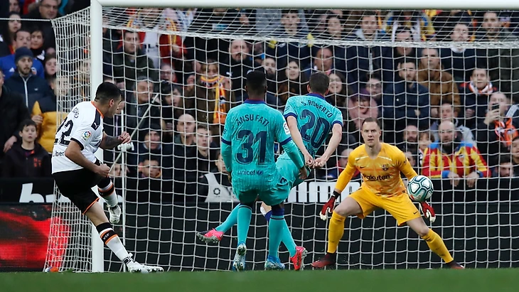 Весь первый тайм прошел по одному сценарию – «Барселона» забрала под полный контроль мяч и бесконечно перекатывала его возле штрафной Доменека, не создавая при этом и маломальской угрозы воротам. В свою очередь «Валенсия» бесподобно защищалась, насыщая зоны возле мяча и не давая каталонцам использовать разрезающие передачи, а в случае перехвата или отбора летела в контратаку, и из раза в раз доставляла неприятности тер Стегену, только благодаря которому гости не ушли на перерыв, разгромно проигрывая. Важную роль в такой игре хозяев сыграли Коклен и Кандогбиа, классно защищавшиеся (совершили 8 перехватов на двоих за весь матч, для сравнения у «Барселоны» 4 перехвата на всех, конечно во многом это связано со стилем игры, но тем не менее) против юрких футболистов соперника и позволявшие нападающим убегать в контратаку. Бывший игрок «Арсенала» вообще шикарно противостоял Лионелю Месси, не давая аргентинцу почувствовать свою игру. «Валенсия» за первый тайм создала несколько отличных моментов, но не смогла их реализовать, а также заработала пенальти (Пике снес Гайя), но его потащил тер Стеген.
