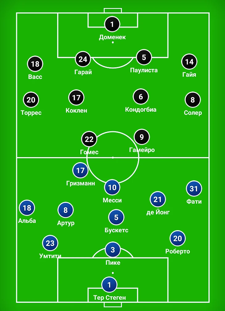 Для меня матч в Валенсии стал первым знакомством с Кике Сетьеном в роли главного тренера «Барселоны» и он сразу смог меня удивить необычной расстановкой с тремя защитниками. К Пике и Умтити добавился Серджи Роберто, ставший правым центральным защитником, фланги были отданы на откуп Альбе и Фати, а в атаке Месси исполнял роль ложной девятки, часто опускаясь за мячом не только к центральному кругу, но и на свою половину поля. Гризманн частично исполнял роль травмированного Суареса, но при этом и часто смещался на фланг.