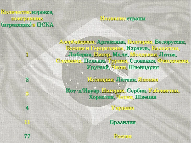 В виде небольшого бонуса я подсчитал количество россиян и легионеров, поигравших в ЦСКА за 19 лет, и определил, выходцев из какой страны было больше всего, вот результаты статистических подсчетов: