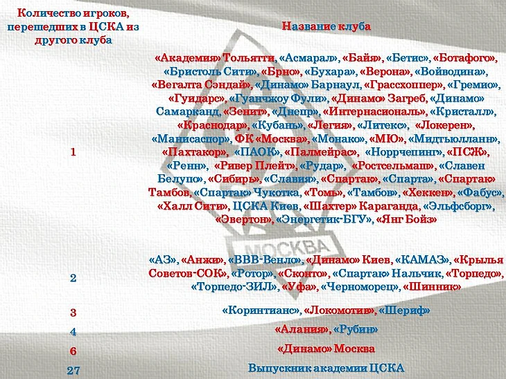 Ко всему вышеперечисленному конечно стоит отнести и великолепную трансферную политику ЦСКА, благодаря которой в команде появлялись малоизвестные футболисты, и воспитывались до добротного европейского уровня – сначала они помогали завоевывать трофеи, а потом за счет своего ухода позволяли команде существовать и продолжать круговорот дешевых покупок и дорогих продаж.