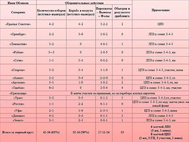 Еще одним минусом в защитных действиях Облякова за первый круг следует признать желтые карточки. Иван зачастую грубо фолит или явно срывает контратаки соперников. «Горчичник» «горчичнику» рознь, но по статистике каждое пятое нарушение правил армейцем приводило к предупреждению.