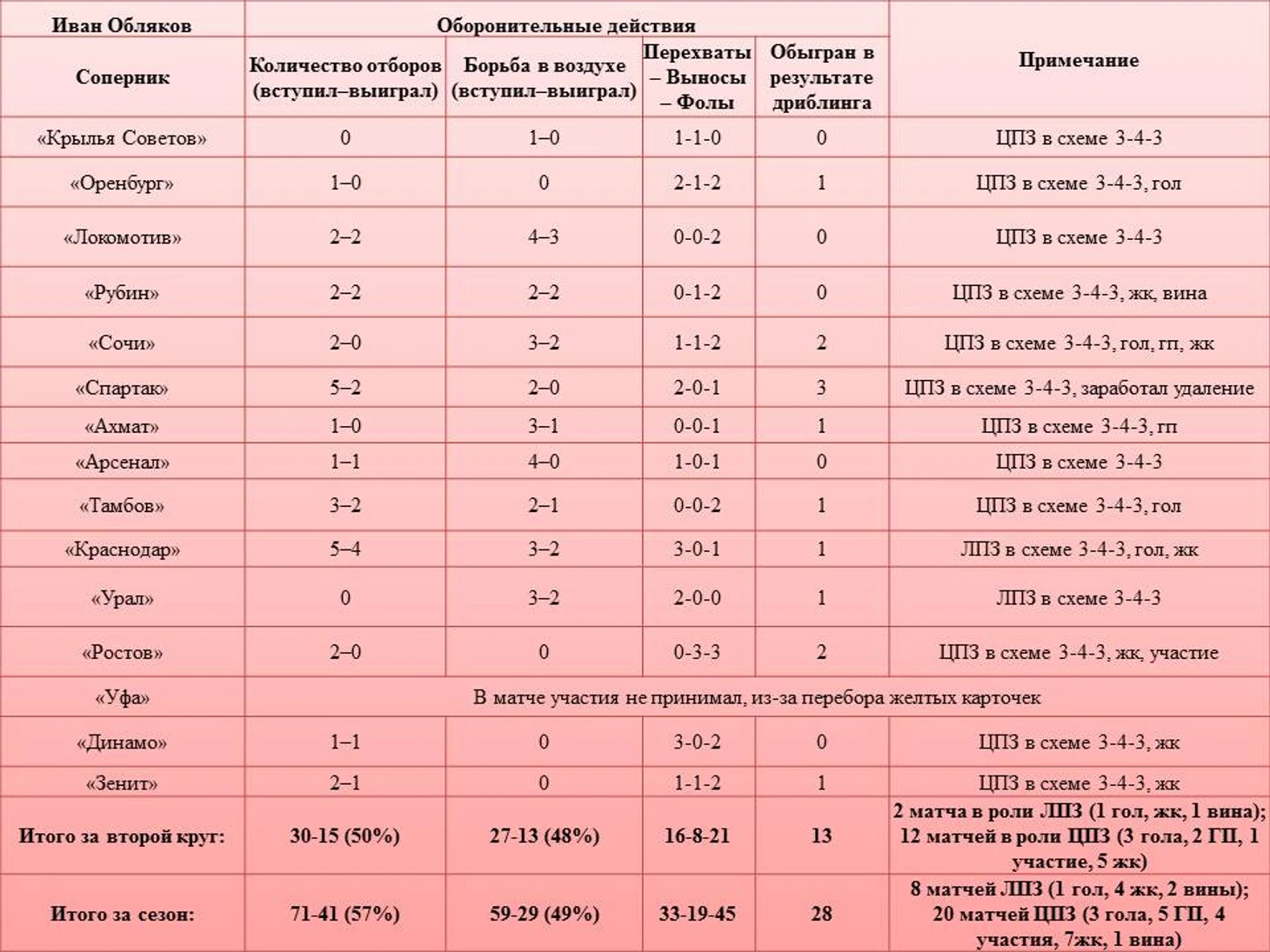 Но, как и в позапрошлом сезоне, значительный прогресс Ивана наметился уже после зимнего перерыва. Причиной тому не только переформатирование атакующей манеры игры армейцев, но и попадание в стартовый состав Константина Марадишвили, значительно разгрузившего Облякова по части оборонительных действий, в которых статистически последний «просел».