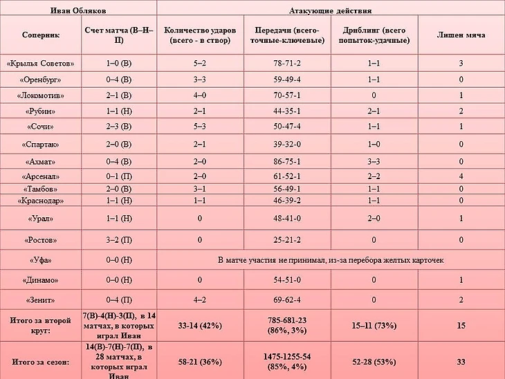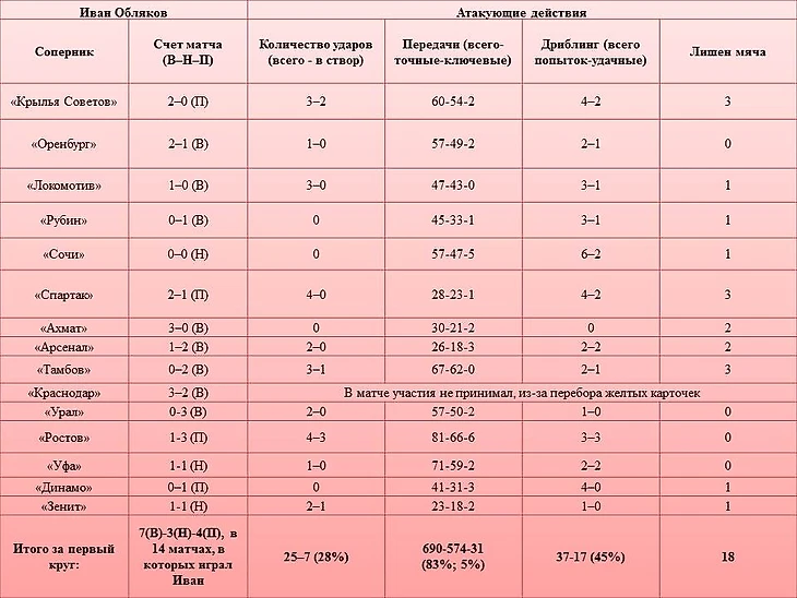 Резюмируя по Облякову, можно сказать, что Виктор Михайлович неслучайно доверяет молодому полузащитнику. Да, ему еще не хватает стабильности, чтобы выдать полноценный классный сезон, но лично на мой взгляд прогресс у Ивана на лицо. Чтобы не быть голословным сравню выступление Облякова с ведущими игроками его амплуа в российском чемпионате.