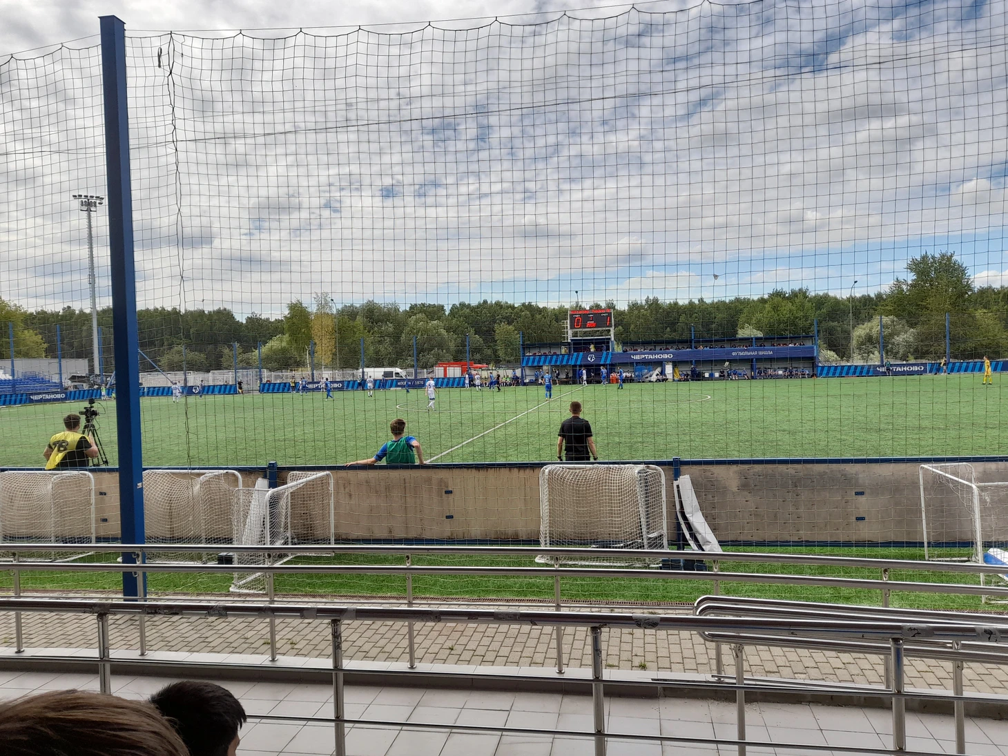 Стадион расположен очень удобно, близко к метро и не очень далеко от центра города. Ближе всего идти от метро Южная, от Чертаново прогулка получится дольше. Район, к слову, очень зелёный. На входе все прошло очень быстро, без каких либо очередей. Однако, сам стадион меня не очень впечатлил. Первое, что бросается в глаза - сетка почти по всему периметру поля, что немного непривычно после больших стадионов. Ещё из минусов отметил бы ужасный звук, диктор на стадионе по качеству звучания сравним с аниматором в турецком отеле, который всех зовёт на аэробику. Зрителей было человек 150, активная поддержка была у обеих команд, что немного удивило. Также порадовала, крыша над трибунами, которая может спасти во время дождя или палящего летнего солнца.