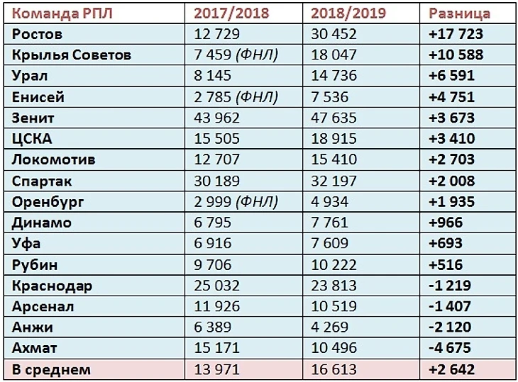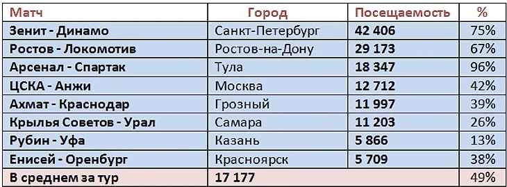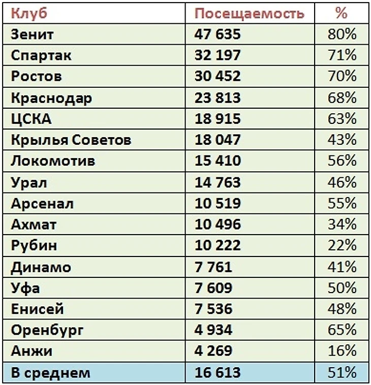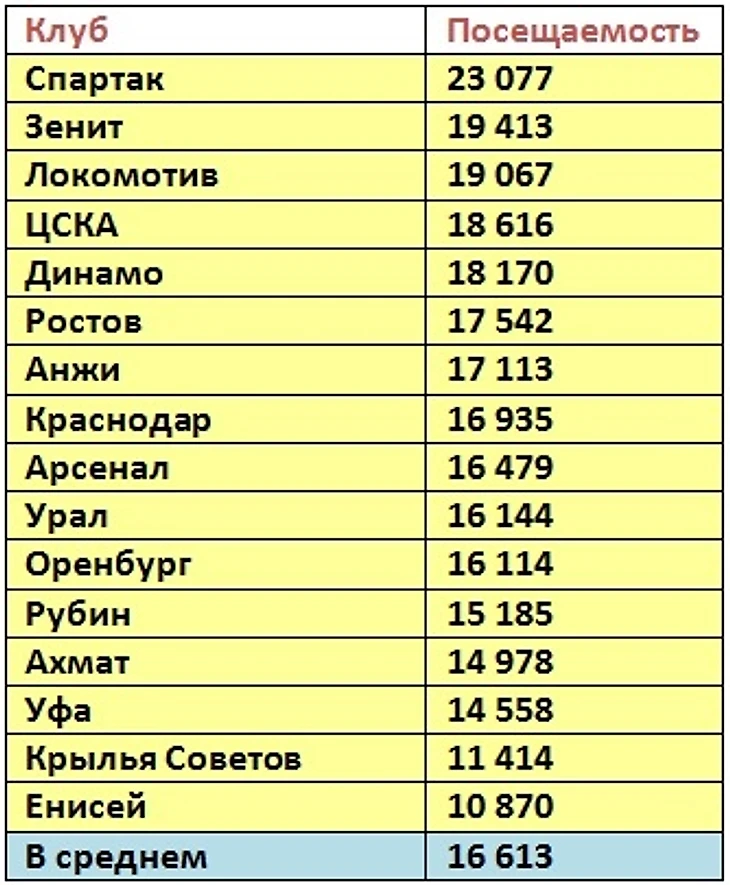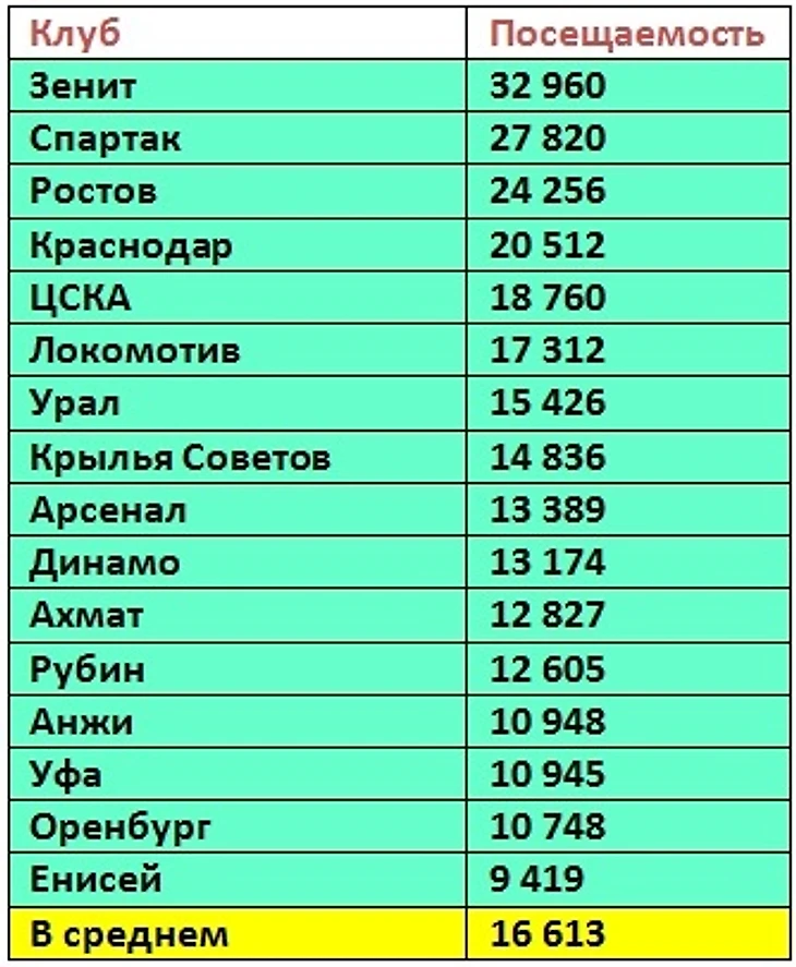 Средняя домашняя посещаемость клубов РПЛ, после 25 тура: