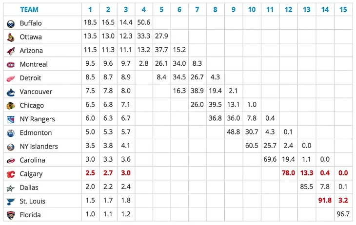 После расширения лиги в процессе принимают участие 15 команд, то есть, все те, кто не вышел в плей-офф. Но это номинальная цифра, которая не учитывает разнообразные обмены. Вот и на этот раз на старт лотереи выйдут 14 команд – шансы «Калгари» достанутся «Айлендерс» в качестве компенсации за переход защитника Трэвиса Хэмоника.
