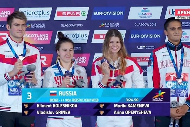 В смешанной кролевой эстафете россияне в составе Климента Колесникова, Владислава Гринева, Марии Каменевой и Арины Опенышевой стали бронзовыми призерами со временем 3.24,50.