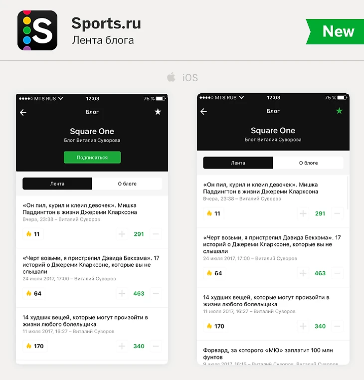 Вслед за лентой блога в Android, мы обновили блоги и для пользователей iOS. Теперь экран блога стал выглядеть по-человечески, а главное подписываться на понравившиеся блоги стало намного удобнее – достаточно нажать на большую кнопку “Подписаться”.