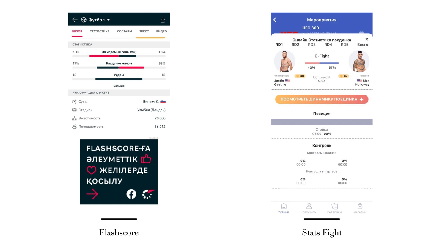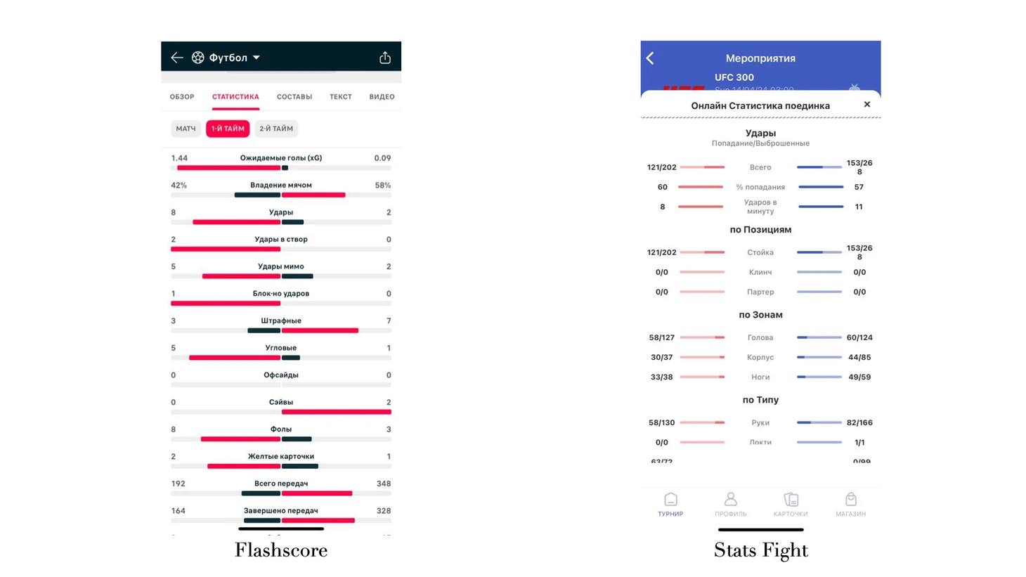 Stats Fight: MMA Score & Picks – это приложение, специализирующиеся на статистике и аналитике единоборств. Приложение доступно только в AppStore и Google Play, сайта со статистикой у проекта нет. Отличительной особенностью приложения Stats Fight от Flashscore и других подобных ресурсов, что команда приложения собирает более 100 показателей поединка единоборств в реальном времени самостоятельно. Поставщиков услуг по сбору статистики в ММА в мире можно посчитать на пальцах одной руки и часть из них давно стали частью промоутерских компаний, и в итоге собирают данных только для одной организации.