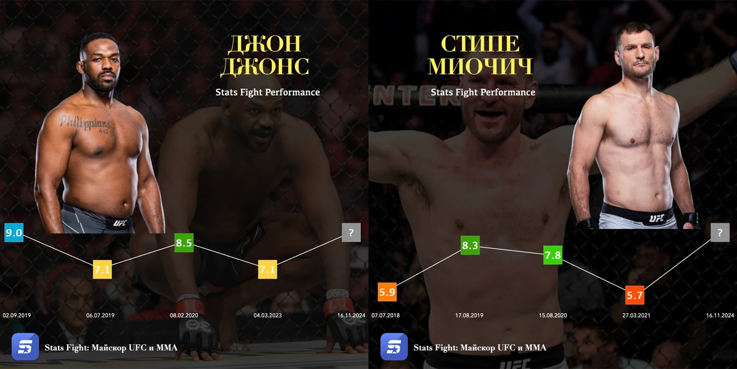 Предлагаем вспомнить, какие оценки Джонс и Миочич получали от Stats Fight Performance за выступления в предыдущих боях.