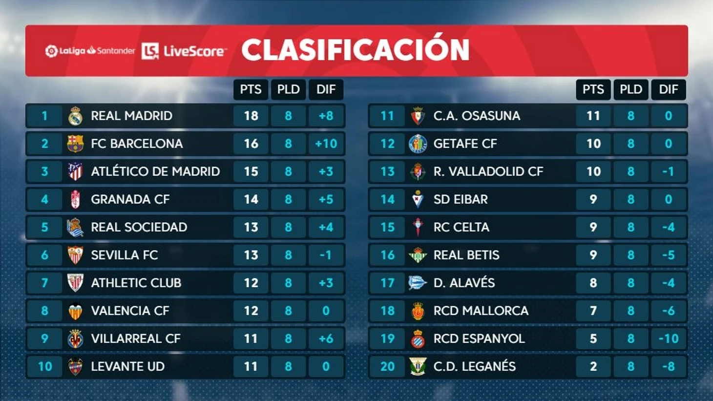 Любителей испанского футбола впечатляет и конкурентоспособность новичков – 32%. Из трех клубов, поднявшихся из дивизиона Сегунда, два по-настоящему классно начали сезон: "Гранада" четвертая, а "Осасуна" девятая. Правда "Мальорка", еще один новичок, занимает скромное 18-е место и находится в зоне вылета.