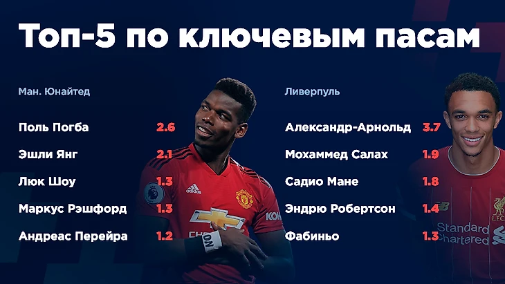 "Ливерпуль" и "Ман Юнайтед" имеют равную статистику по модели xPTS. Посмотрим на топ-5 созидателей обеих команд.