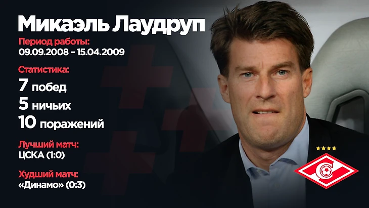 Микаэля Лаудрупа на пост главного тренера пригласил новый генеральный директор “Спартака” Валерий Карпин. Датчанин приходил в клуб, как европеец с прогрессивными взглядами, давал футболистам много свободы, а все тренировки строил исключительно через упражнения с мячом. Не помогло: “Спартак” слишком быстро посыпался, провалив сезон и в чемпионате России (8 место в 2008-м году), и в еврокубках. Не задалось и начало следующего: поражения от “Кубани” и “Москвы” и ничья с “Зенитом” при одной победе над Нальчиком (2:0) разочаровали Федуна и Карпина. 15 апреля Микаэль Лаудруп был уволен с поста главного тренера “Спартака”.