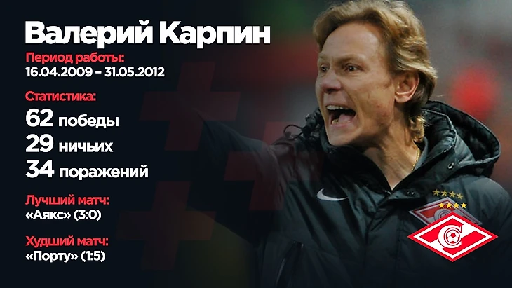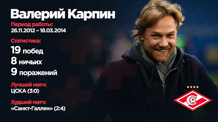 Второй заход Валерия Георгиевича получился не таким удачным, как первый. Он подхватил команду после ухода Эмери только в 18-м туре сезона 2012/13 и немного выправил ситуацию. В 12-ти играх под руководством старого нового коуча “Спартак” одержал шесть побед, трижды сыграл вничью и проиграл “Зениту”, “Ростову” и “Мордовии”. В Лиге Европы “красно-белые” жестко опозорились, отлетев в квалификации от швейцарского “Санкт-Галлена”. На выезде сгоняли ничейку (1:1), а дома ноунеймы загрузили “Спартаку” четверочку (2:4). Федун уволил Карпина после упущенной победы над “Анжи” (2:2), когда команда пропустила решающий гол на 94-й минуте, позволив аутсайдеру уйти с 0:2. То увольнение сам Карпин до сих пор считает несправедливым и эмоциональным, ведь отрыв от лидирующего “Локомотива” составлял всего четыре очка, а впереди было еще девять туров.