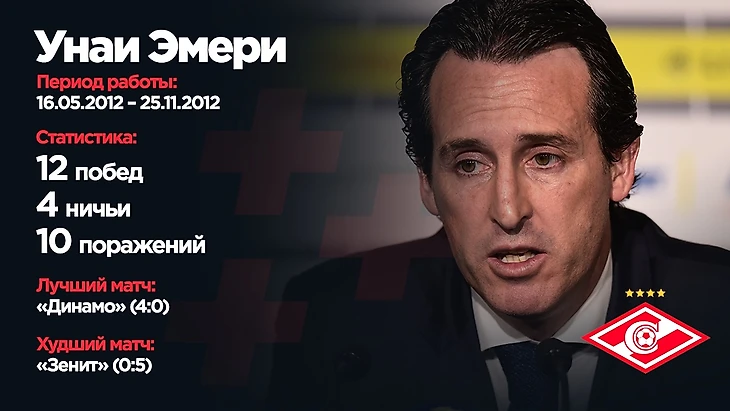 Испанец получил приглашение возглавить “Спартак” от своего давнего знакомого Валерия Карпина. Тот по окончании сезона 2011/12 вернулся в удобное и мягкое кресло генерального директора, а баску доверил вести клуб к новым высотам. Эмери уже тогда был коуч с хорошим бэкграундом: он с “Валенсией” занял третье место в Примере вслед за “Барселоной” и “Реалом”, а его команда играла в комбинационный футбол. Казалось бы, то, что нужно “Спартаку”. Но период работы Унаи получился очень коротким: яркий выход в ЛЧ через “Фенербахче” сочетался с такими провальными поражениями, как от “Зенита” (0:5) и “Динамо” (1:5). Нервы Карпина и Федуна не выдержали после унижения в “Лужниках” от Кокорина и Ко, и испанец был отправлен в отставку. Именно после того матча Дзюба в микст-зоне бросил фразу про тренеришку в адрес Эмери.