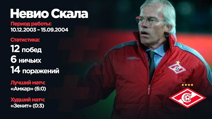 56-летний тренер возглавил “Спартак” в декабре 2003-го года, когда президентом клуба был Андрей Червиченко и продержался не очень долго. Хотя старт чемпионата России у “красно-белых” получился бодрым. В первых семи турах “Спартак” одержал четыре победы, дважды сыграл вничью и один раз проиграл. Это позволило команде Невио Скалы возглавить турнирную таблицу. Москвичи, перед тем как выйти на первую строчку, уничтожили “Амкар” (6:0), хет-трик сделал 19-летний Александр Самедов, еще один гол забил 20-летний Павел Погребняк. “Молодые воспитанники заиграли, а какие золотые у нас легионеры! Точно снова станем чемпионами”, – возможно, именно тогда был запущен знаменитый цикл жизни всех коучей “Спартака”.