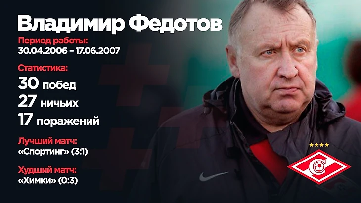Федотов после увольнения Старкова в очередной раз принял “Спартак” на седьмом месте, выдал классную беспроигрышную серию из 10 матчей и получил заслуженное утверждение на посту главного тренера. Владимир Григорьевич очень часто приходил в “Спартак” в качестве и.о и наконец-то сумел избавиться от этой унизительной для любого тренера приставки. В первый же сезон под его руководством “Спартак” взял серебро и достойно дебютировал в Лиге чемпионов, заняв третье место в группе с “Баварией”, “Интером” и “Спортингом”. В следующем году “красно-белые” не проигрывали на протяжении девяти туров, а потом вдруг влетели “Химкам” (0:3), “Локомотиву” (1:2), сыграли вничью с Нальчиком (2:2) и отлетели от “Москвы” (0:2). Этого Федотову Федун не простил и после поражения от “горожан” уволил тренера. Позднее супруга Владимира Григорьевича признавалась журналистам в том, что от такого потрясения ее муж так и не сумел отойти до конца жизни.