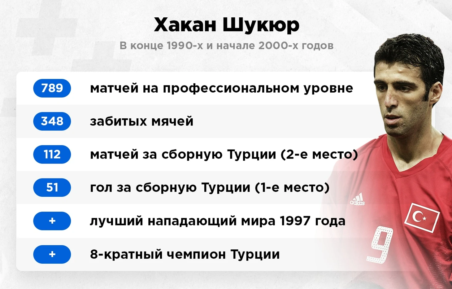 В конце 1990-х и начале 2000-х годов турецкий футбол был на подъеме: “Галатасарай” брал Кубок УЕФА (сезон 1999/2000), а национальная сборная добыла бронзу на ЧМ-2002. Шукюр был в эпицентре тех успехов, являясь основным форвардом в обеих командах. Вот лишь небольшой список его достижений: