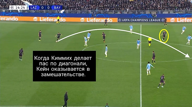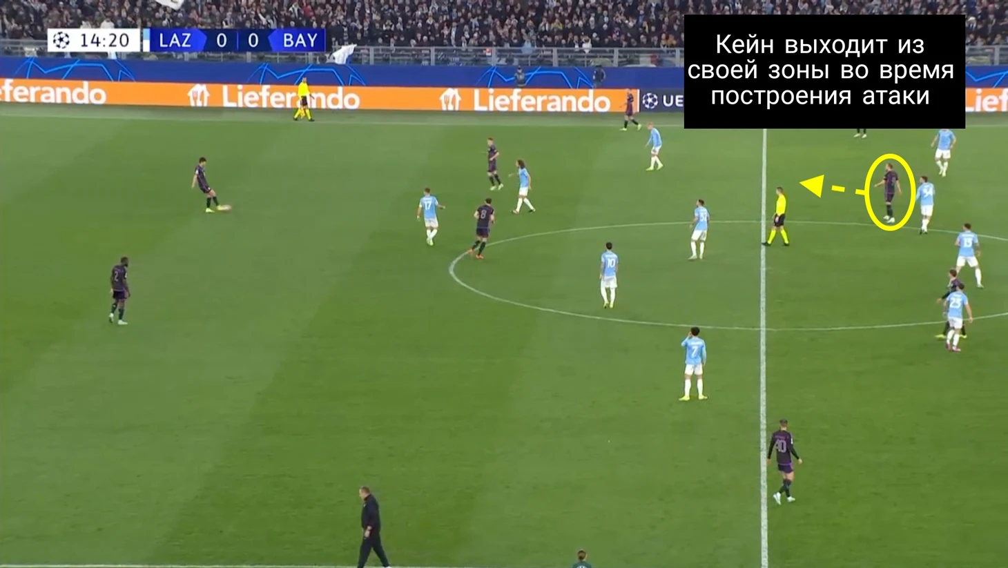 Все знают, что Кейн любит покидать линию атаки, чтобы объединиться с товарищами по команде и перетаскивать центральных защитников соперника с места на место. Это прекрасно работает в Бундеслиге, где его 24 гола являются максимальным показателем в пяти лучших лигах (опередив Килиана Мбаппе из «Пари Сен-Жермен», занявшего второе место с 20 голами). Однако в матче с «Лацио» из-за отсутствия лидирующего центрального нападающего «Баварии» было тяжело.