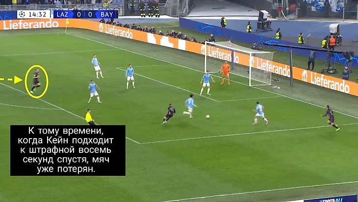 Возьмём этот эпизод, где Кейн опускается в левое полупространство, чтобы помочь во время построения атаки. Когда Киммих пытается взвинтить темп, выведя Лероя Сане вперед великолепной длинной диагональю, Кейн даже не успевает вернуться в кадр, как мяч уже потерян.