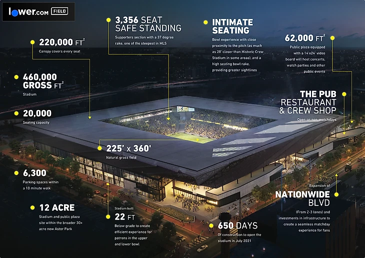Небольшая арена в столице Огайо является отличным примером современного стадиона МЛС - кроме необычного темного дизайна она сразу проектируется с городским кварталом, и совсем скоро обзаведется торговым, жилым и спортивным центр по соседству. Еще одна тенденция стадионов США - наличие панорманого вида на центр города и небоскребы, на этот раз - со стороны одного из входов на стадион. Даже небольшие арены МЛС еще до открытия получают спонсорское название - с заключением контракта подсуетился финансовый сервис lower.com.