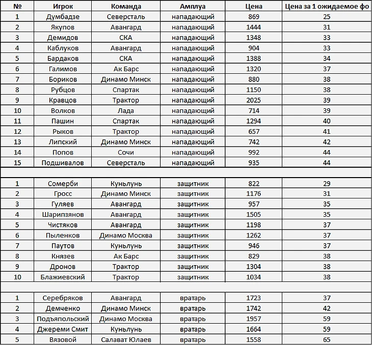 4. И наконец, финальная таблица. Для тех, кто хочет прикупить недорогого хоккеиста, который максимально эффективно отработает потраченные на него фо.