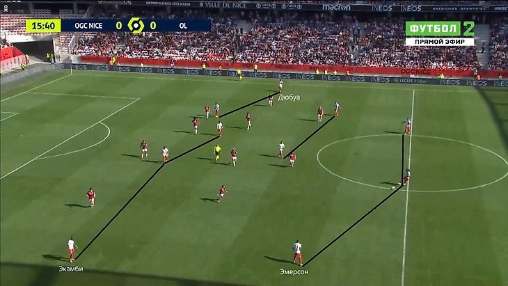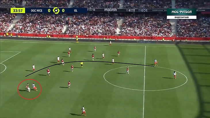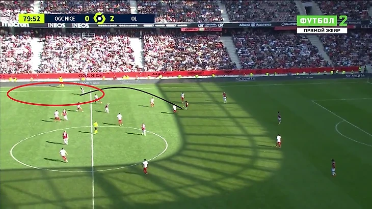 10. Во втором тайме Ницца начинала атаки с помощью забросов за спину. Это было связано с высоким расположением линии защиты у Лиона. Однако проходить забросы начали лишь после выхода на поле Аталя. Алжирец идеально подошёл для такой манеры игры и полностью переиграл Эмерсона. Примечательно, что Аталь поучаствовал во всех 3 голах Ниццы. Первый гол- воплощение плана Голтье: заброс за спины защитникам, и проход на скорости от алжирца с хорошим завершением.