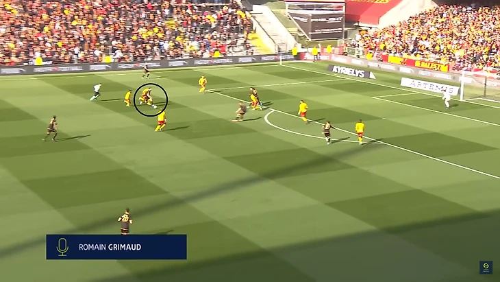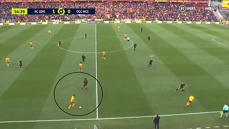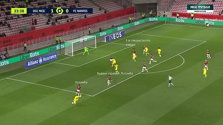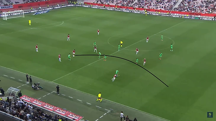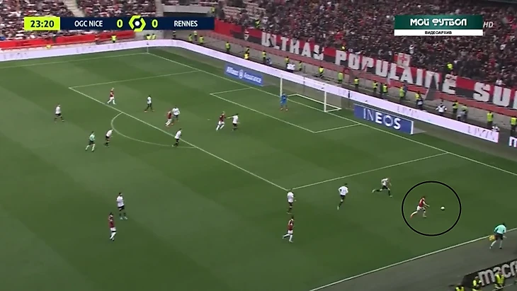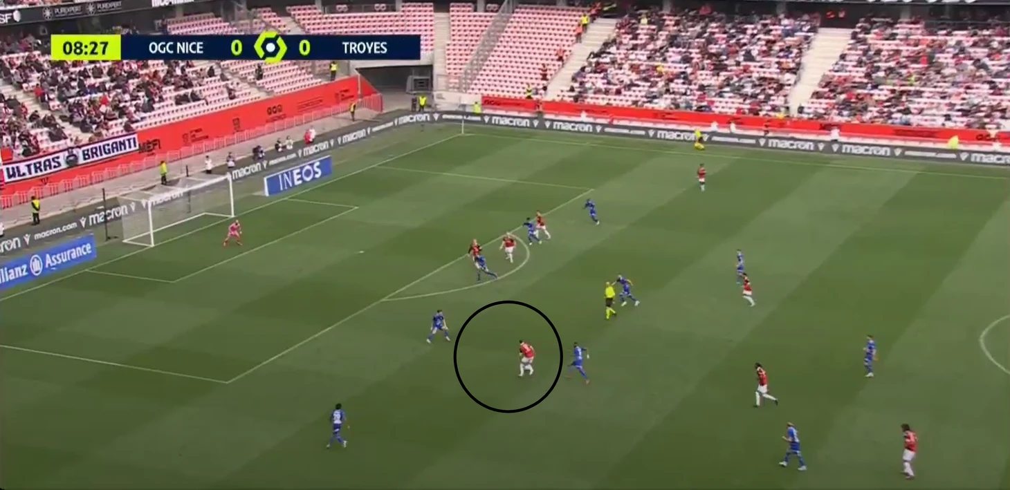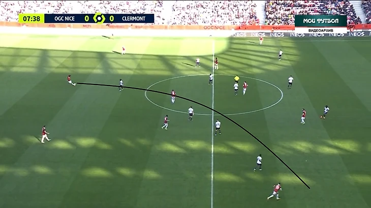 Еще один вариант Ниццы для начала атаки- пас на опустившегося Гуири, который уводит пз, и отдаёт пас Бару на свободный фланг.