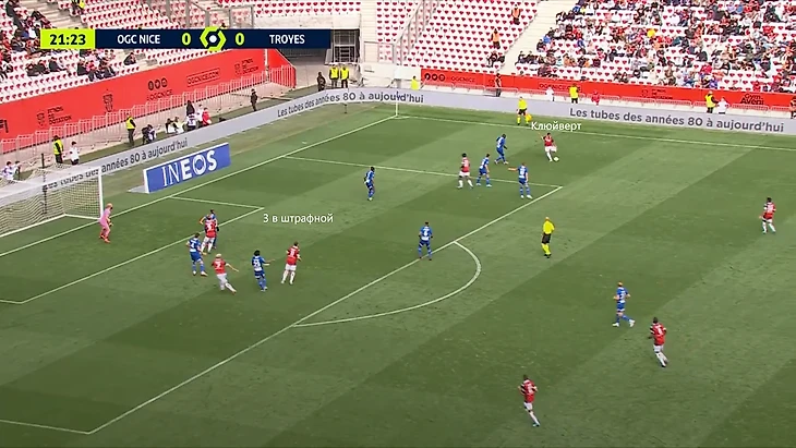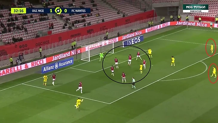 Если кз не удаётся заблокировать подачу, то в зоне подбора и на дальней штанге оказываются свободные соперники. Так как цп Ниццы находятся в штрафной, они не успевают блокировать удар на её границе.