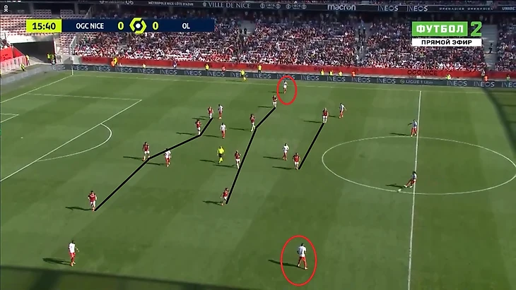 Если же соперники успевают накрывать игроков Ниццы, то команда проводит затяжные атаки с переводами с фланга на фланг, в поисках открытого мяча для подающего.