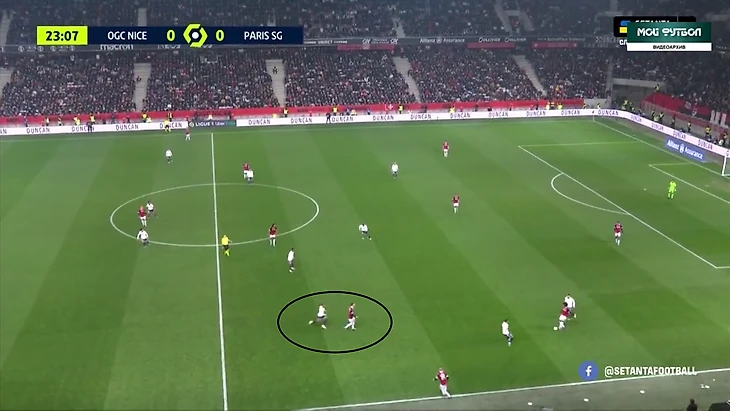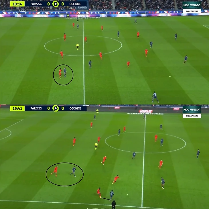 Игроки Ниццы хорошо передают друг другу соперников. ПСЖ в двух матчах пытался манипулировать ориентировками защитников Ниццы, однако у них не получилось этого сделать. Во время розыгрышей ПСЖ в первом матче Лотомба играл по Мбаппе. Но когда мяч получал Мендеш, Лотомба выдвигался на него, а по Мбаппе играл Тодибо.