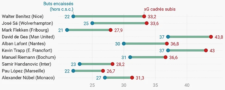 Нельзя не упомянуть и вратаря Ниццы- Вальтера Бенитеса, который стал лучшим вратарем лиги по количеству сухих матчей(14). В этом ему помогла потрясающая игра на ленточке, показатель, по которому он стал одним из лучших вратарей топ-5 лиг.