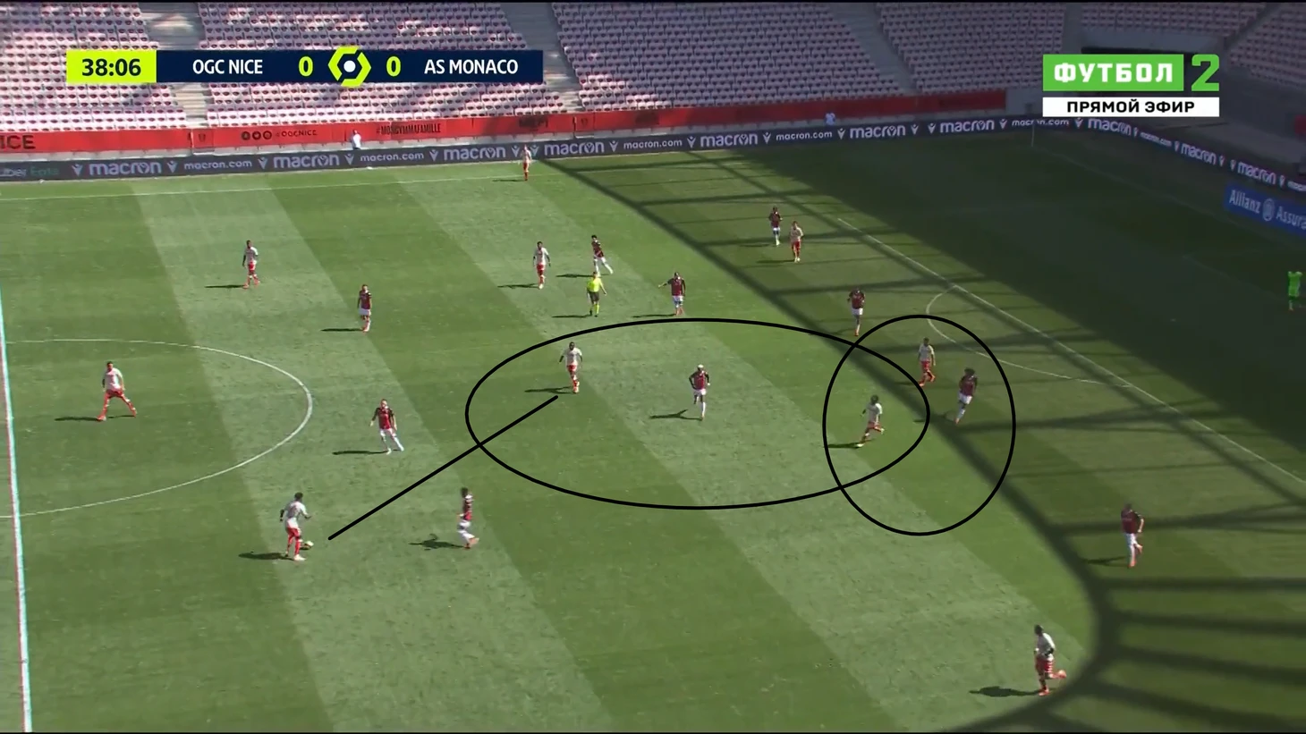 Схема с 2 полузащитниками даёт о себе знать и в негативном ключе. Ницце доставляют неудобства команды, у которых 3 или более игроков действуют между линиями. Благодаря своему движению, соперники создают преимущество в нескольких зонах.
