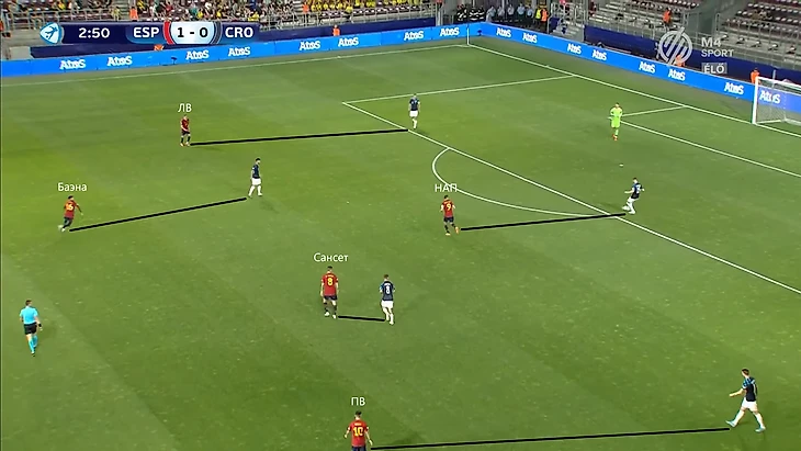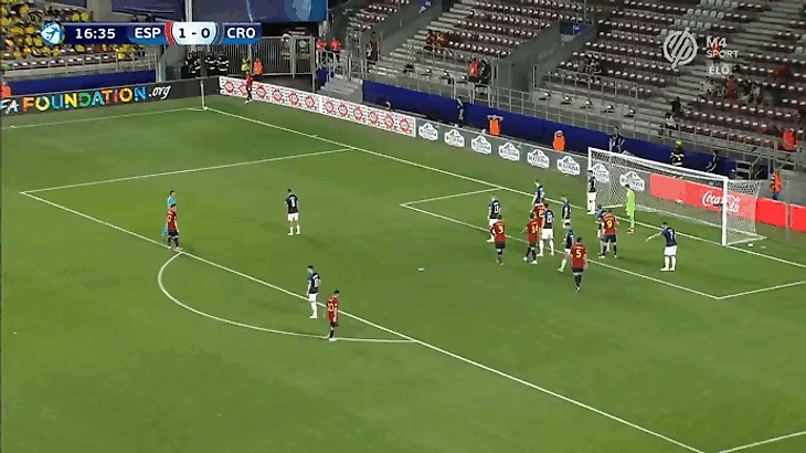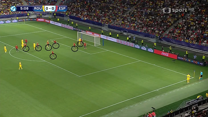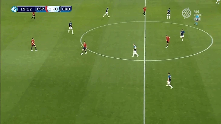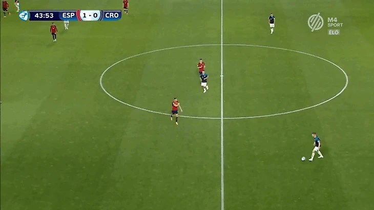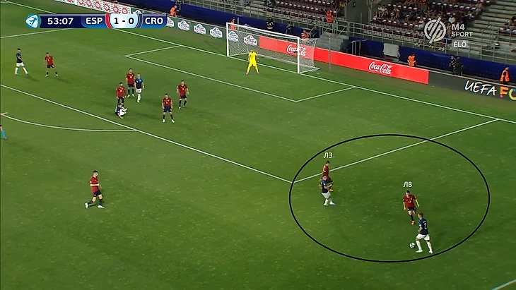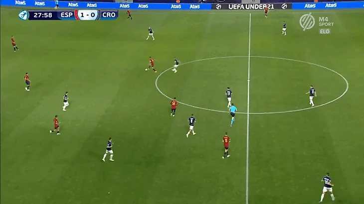 Главной задачей на правом фланге является создание изоляций для лучшего дриблера команды Родри. Он хорошо владеет двумя приемами - умеет раскачивать оппонента корпусом и быстро убирает мяч под правую. Оказываясь 1-в-1 испанец всегда смещается в центр под рабочую левую ногу. Такое движение лучше всего работает, когда кто-то открывается под его пас вразрез. В противном случае испанец выбирает между 2 вариантами продолжения атаки. Первый - попытка пробить в дальний угол. Проблема заключается в предсказуемости такого маневра, из-за чего 60% ударов Родри на турнире заблокировали. Второй вариант - проброс во фланг с последующим кроссом с правой.