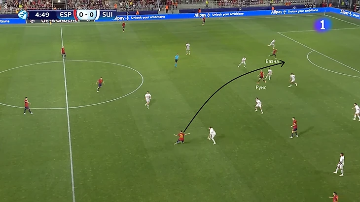 Теньяс также начинал атаки через Абеля Руиса. Он плохо цепляется за спорные мячи- обладает средним телосложением и проигрывает большинство единоборств (42% выигранных на Евро). Несмотря на это, при пасах низом Руис первым оказывается на мяче за счет своевременного рывка вперед. Подбора под Абелем не было, поэтому он отдавал передачи фулбэкам/вингерам. ,,Такой способ прохода давления был запланирован, ведь мы знали, как Швейцария прессингует. Нам пришлось прибегнуть к быстрым выходам с использованием Руиса’’ – говорил тренер команды Дения.