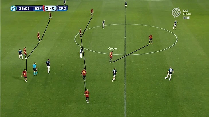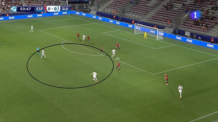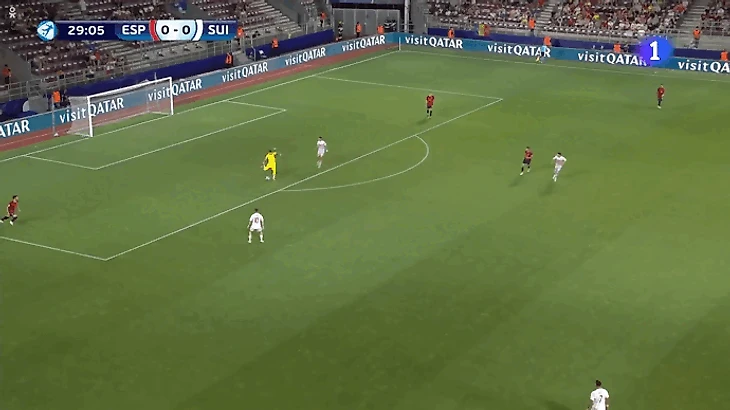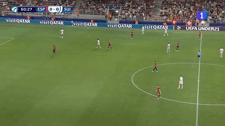 Сложности в стадии розыгрыша возникли со швейцарцами, которые поставили Испанию в неудобное положение. При прессинге они разбирали всю разыгрывающую шестерку, чем усложняли команде выход со своей половины поля. Некоторое время на оценку ситуации получал вратарь Теньяс, от которого напрямую зависела задача по началу атак. Основными адресатами его вертикальных пасов были Ойан Сансет и Руис. Сансет располагался в правом полуфланге около центрального круга. По приему на него выдвигался левый фулбэк Швейцарии, из-за чего ему не удавалось самостоятельно продвигать мяч. Однако пасом на Ойана Испания разбивала давление, ведь прессингующая группа Швейцарии возвращалась в центр.